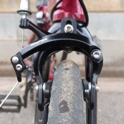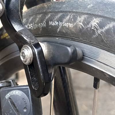 ドライブサイドの右側だけながらシューの下部が少しリムのブレーキ面からハミ出してしまう。 ま、コレくらいなら大丈夫かな。 機会があったらもう少しアーチ長の短いキャリパーブレーキ本体を入手しよう。 いや多分しない。