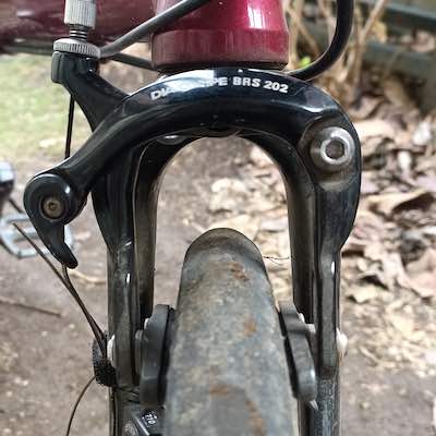 前述の推測通り特定の車体のリアに取り付ける想定だからなのか、前ブレーキのネジ棒が長くて枕頭ナットが使えない↑ なのでネジ帽の短い後ろブレーキに交換して取り付けた↓