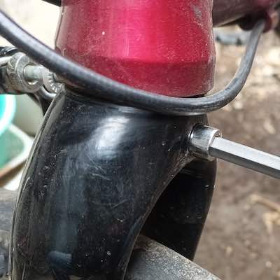 フォークが邪魔で枕頭ナットを強く締め込めなかったので一旦魔具をフォークから外してね。 前ブレーキもナット締めにすれば取り付けられるけど、自転車に携帯している工具だけでやりたかったので六角レンチで締め込む枕頭ナットを使ったです。