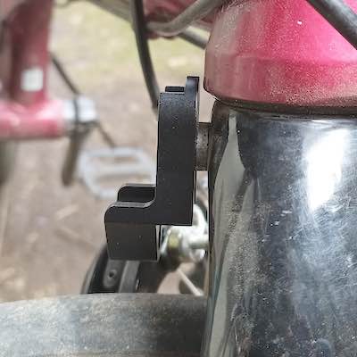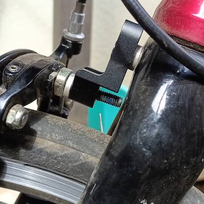 フォークのブレーキ取り付け穴に前側からも後ろ側からもボルトが入らない。 そういえばこの魔具の情報を集めていた時に何かの小径車のチェーンステー間のセンタースタンド台座っぽい箇所に取り付けている画像があって、この魔具は恐らくそういう使い方の物だと思われる。 だからフロントフォークには素直に取り付けられないのかも。 と言う訳で手持ちのボルトやらワッシャーやらを導入して取り付け完了↓