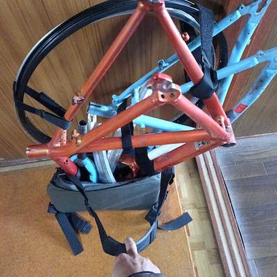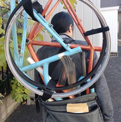 肩掛けに加えて腰でもパチンと止める二点止めのバッグにフレーム2つを無理やり突っ込み、揺れないようにマジックバンドで其処此処を固定。 フレームセット2個とリム2個の 6kg で肩掛けが食い込む。 あとヘルメットの後ろがフレームにガンガン当たるからちょっと下を向かにゃならず。 バッグからはみ出している茶封筒は自転車の譲渡証明書。 必要かと思って。 さあ出発だ!